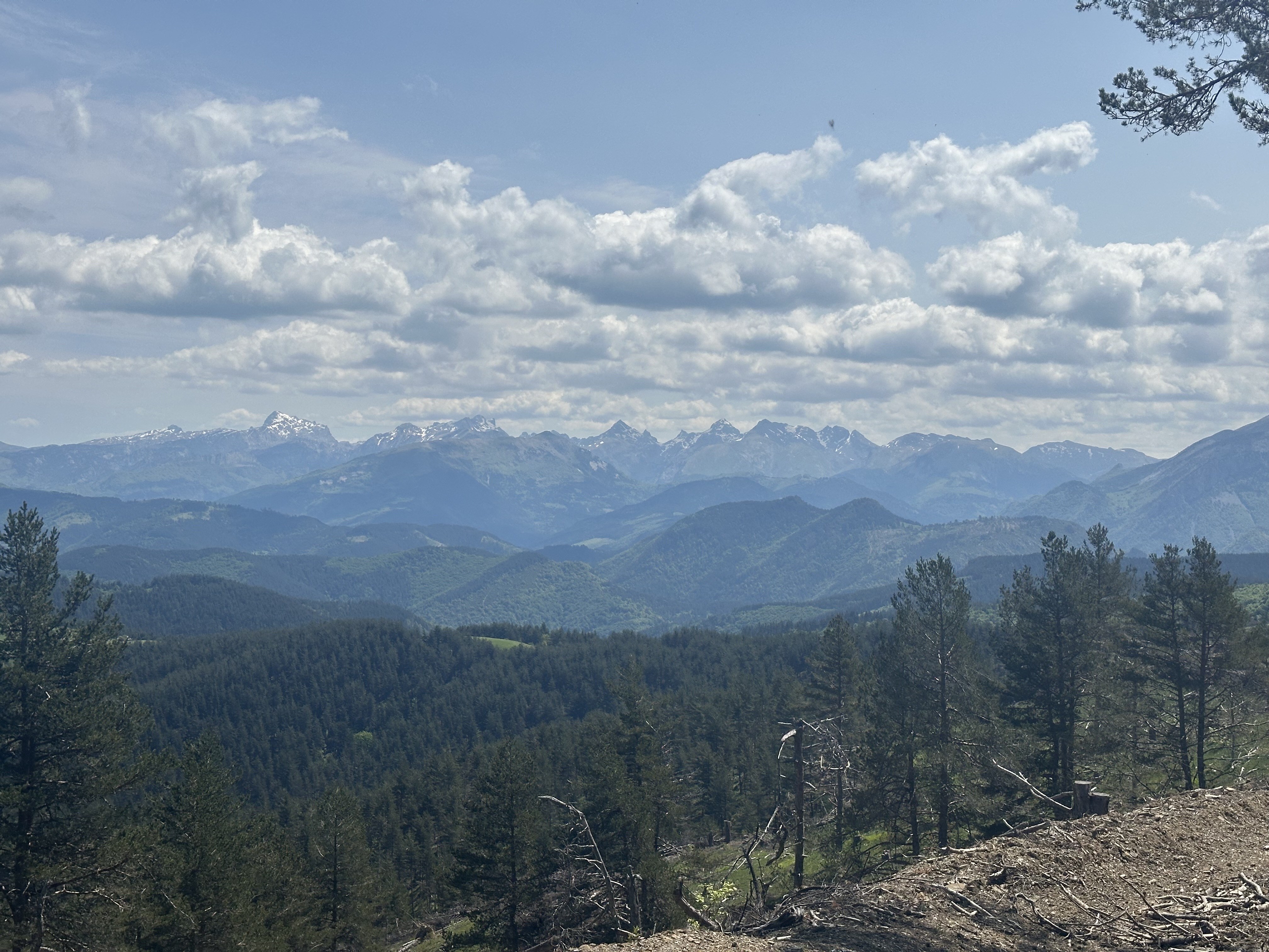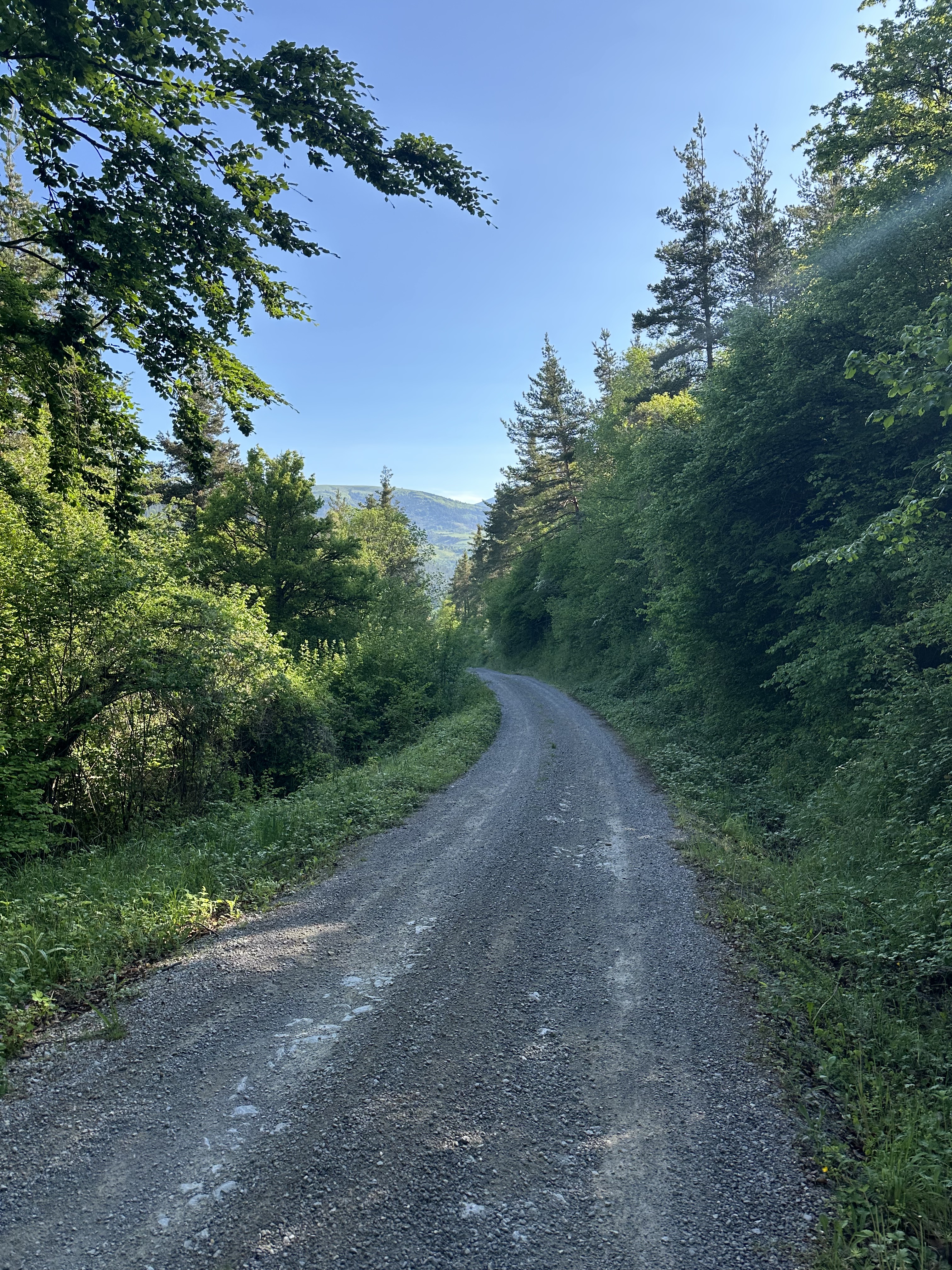 Traversing through the Pyrenees requires a town to stop in every night to obtain rest and provisions. Every day starts with a fairly steep climb, then a transversal along the ridge until a drop down to the next town. The problem with that is invariably the beginning and end of the day has limited ability to see very far because the assent and descent are normally through Woodland. Today was no exception. In fact the first 14 km was on the same gravel track through trees making the day somewhat monotonous. Here is a typical view that we had for the majority of the day. Andreas picked a good day to take a day off.