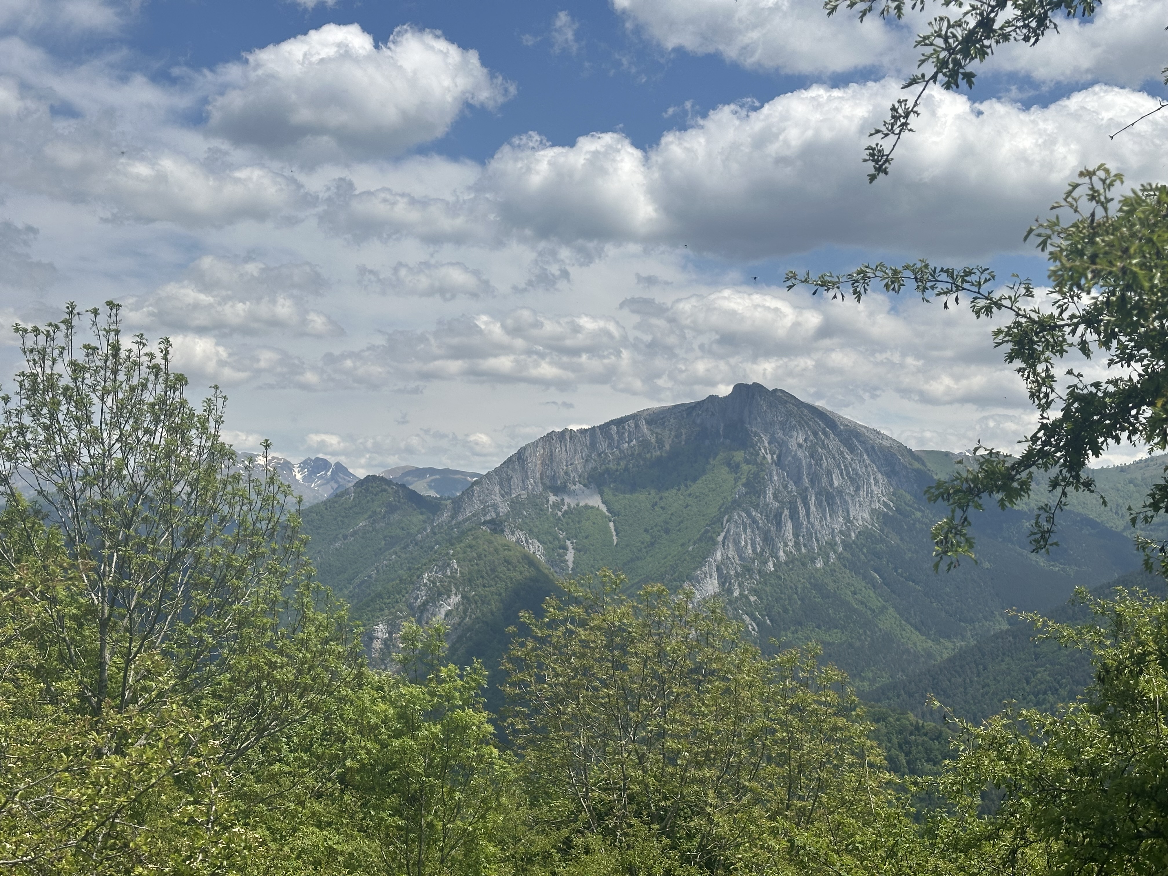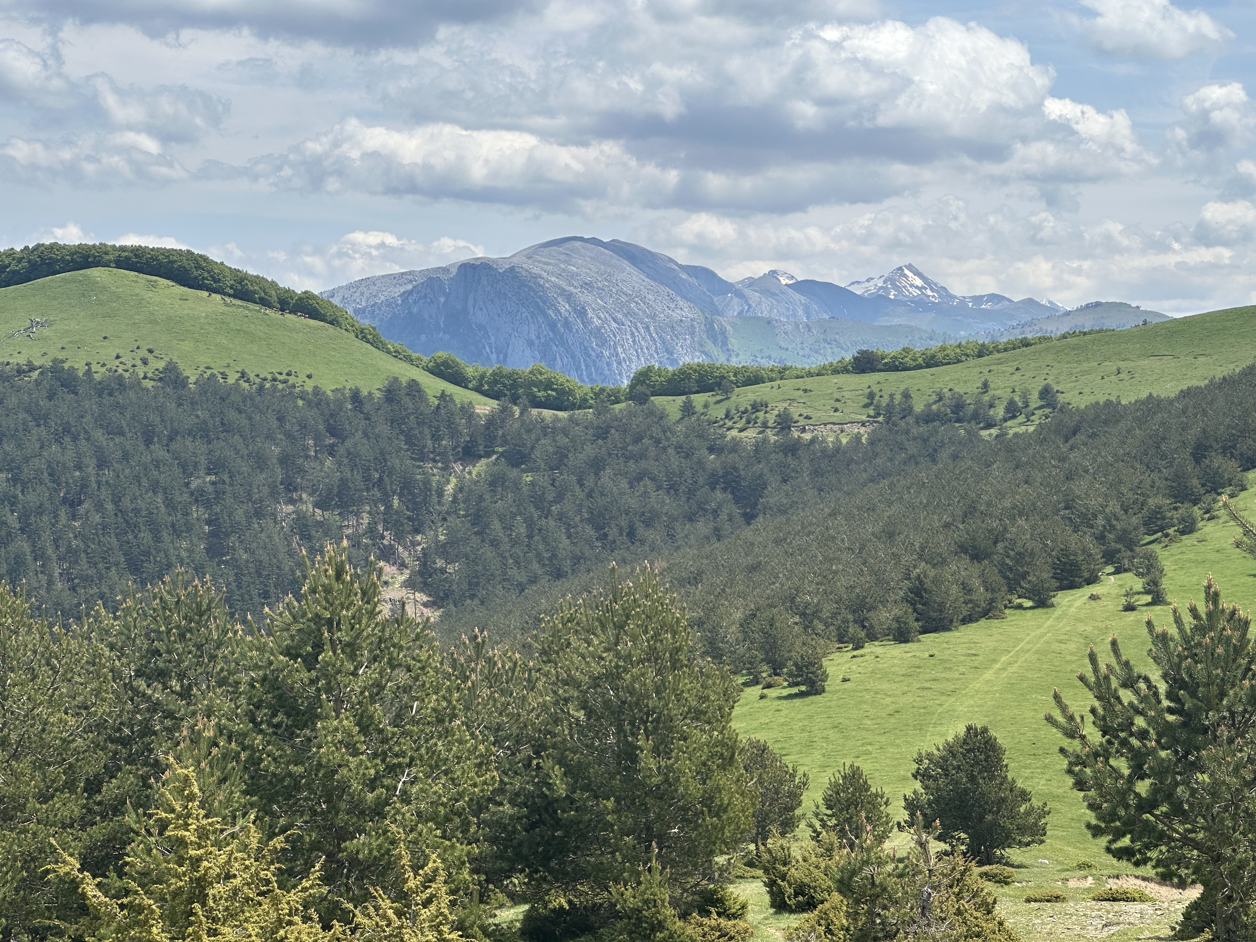 After several hours of walking uphill in the trees, we reached Collado da Saitsederra where the gravel path veered off to our right whilst we continued ahead onto some green pasture. Ahead were the white capped mountains we had first seen yesterday all looking much nearer than we had expected.