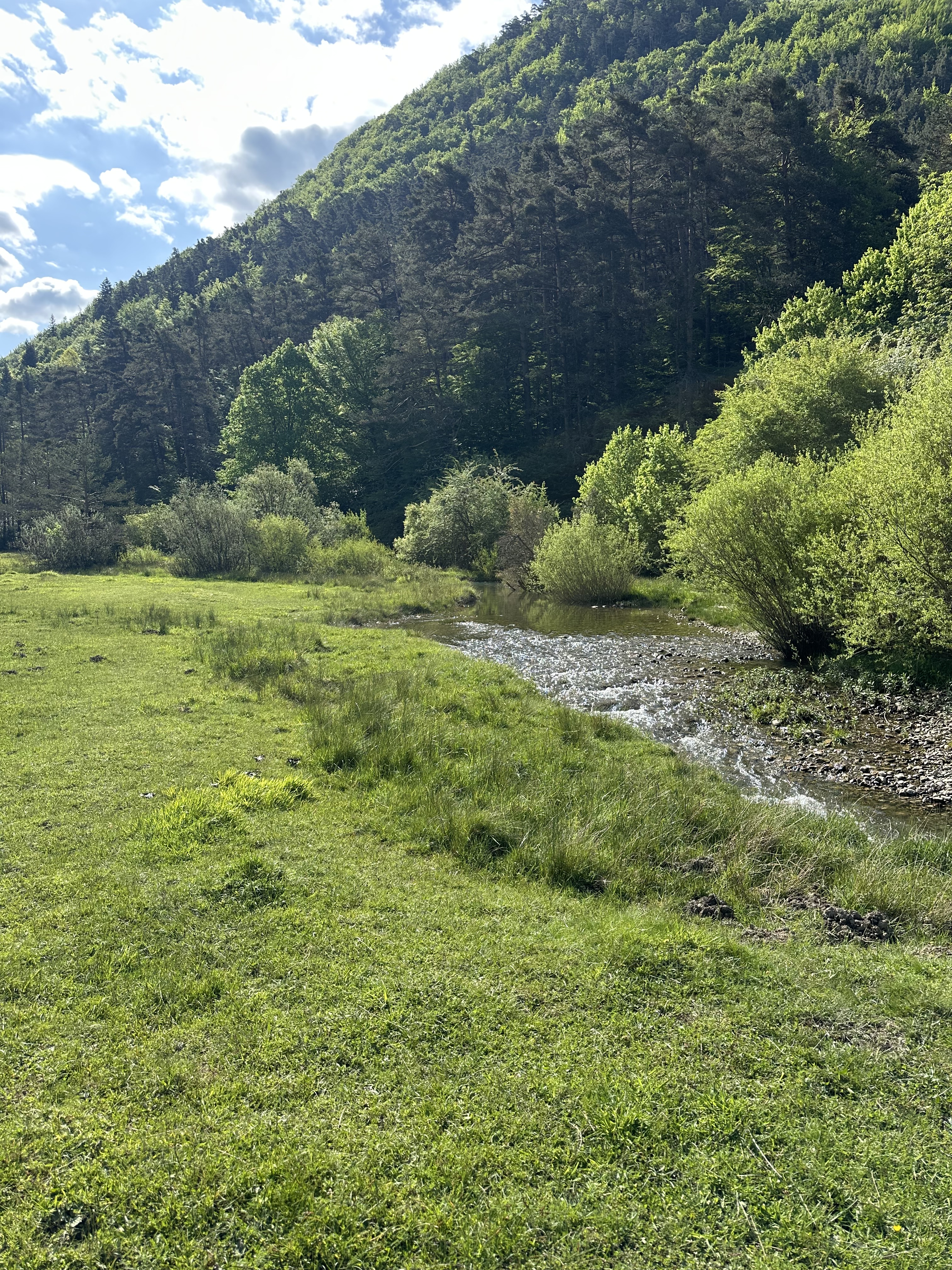 The path came to a clearing between 2 hills/mountains – Alto de Belaisaise on our left and Alto de Belabarze on the right. We followed the river along the river bank for a while but found the grass quite soggy underfoot. We I nstead decided to walk along the road which was alongside the river. This was fine for a couple of kilometres until our progress was impinged by cattle loose on the road. What stopped us in our tracks was a bull and a cow inflagrante in the middle of the road and didn’t look like they wanted the distraction of people walking past them. We decided to take evasive action jump jumping over the river and rejoined the official path just as it started its climb into the woods again.