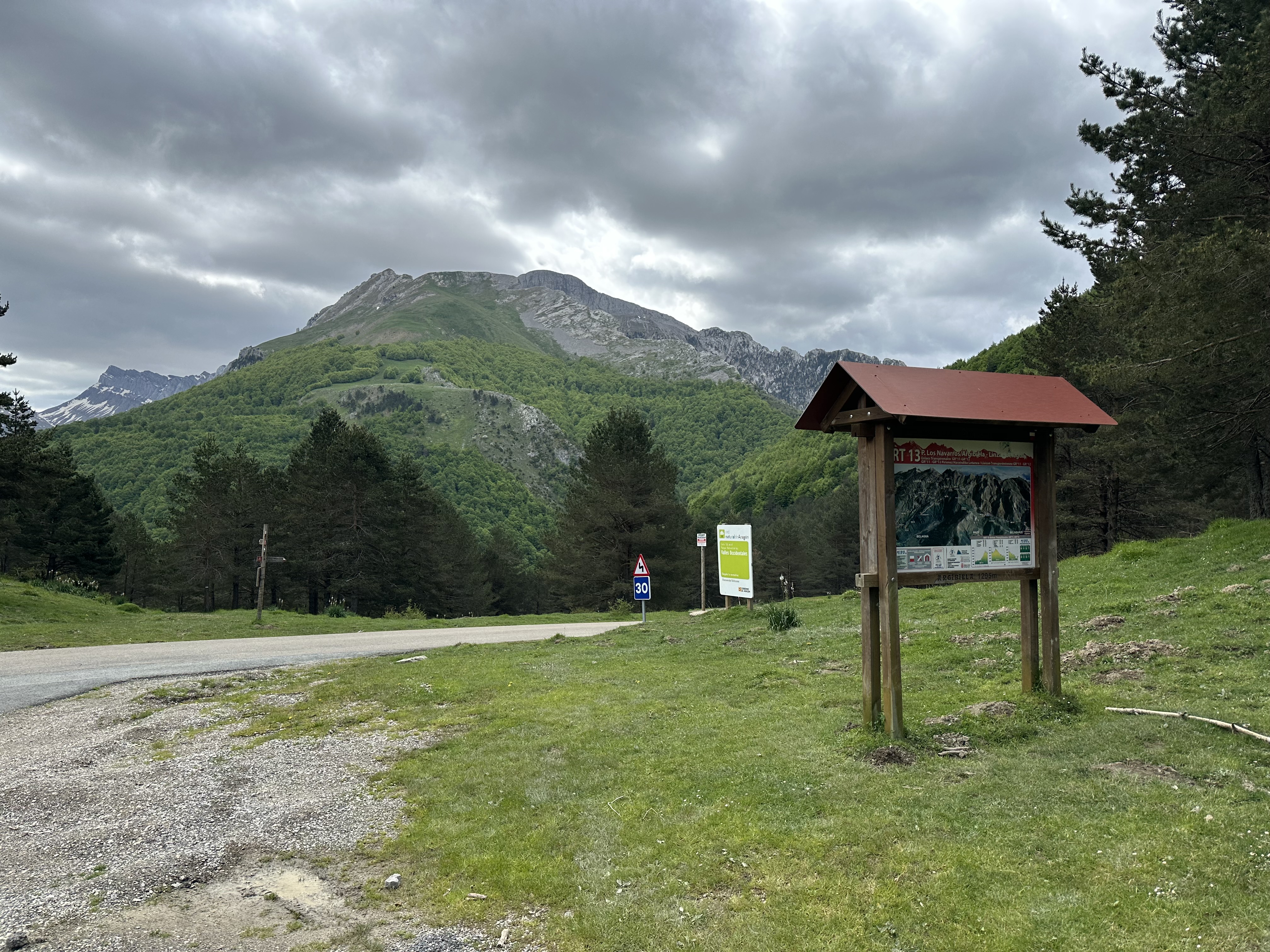 Through the woods the path flattened off, reaching the Coll d’Arguibiela where it crossed the road we had walked along earlier. The signage shown advises that we were now leaving Navarra and entering Aragon.