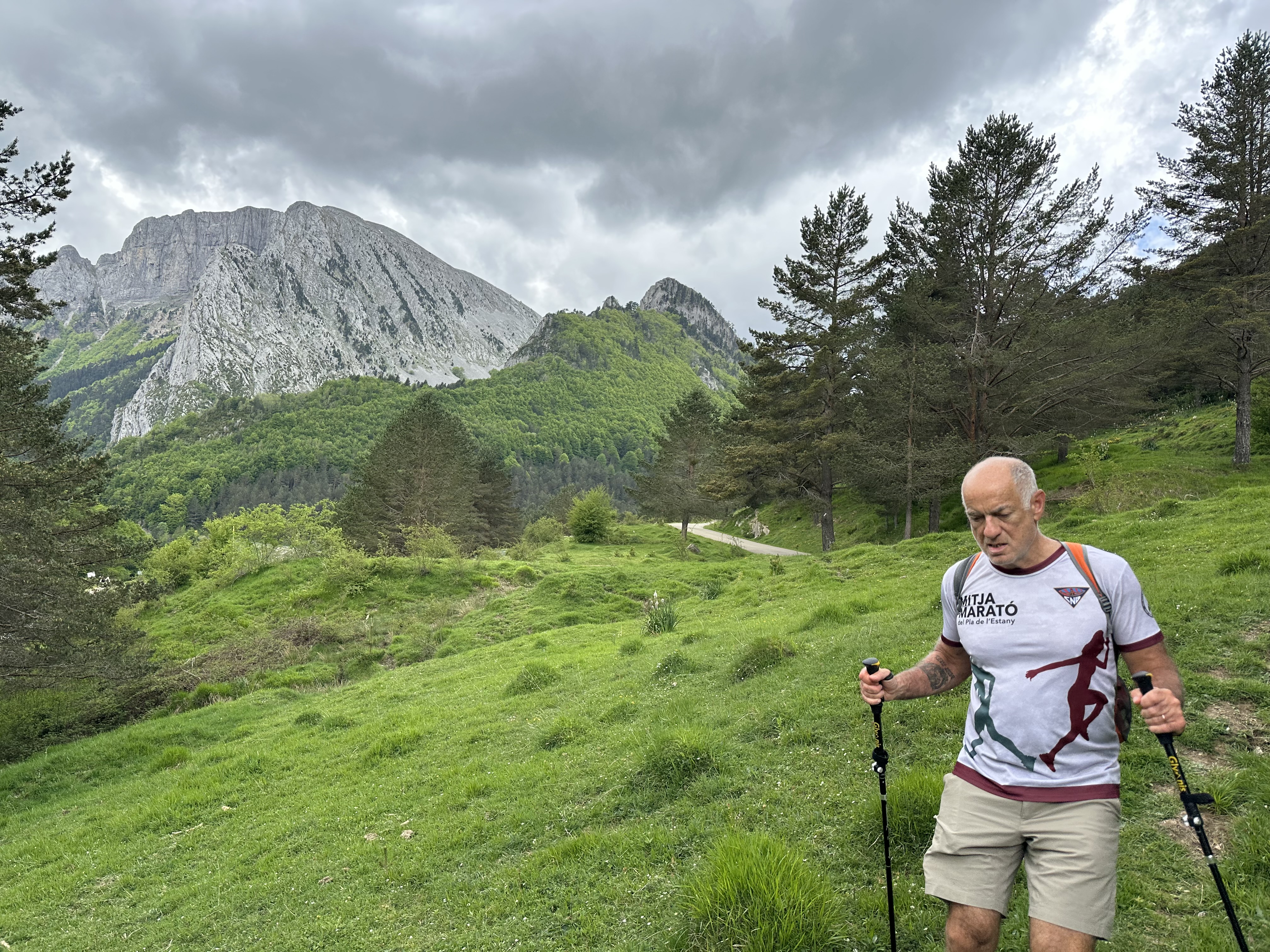 The final one kilometre has an easy descent into Zuriza, and which offered the best views of the day. Here’s one of Jason, concentrating on reaching the finish line a few hundred yards further on, with a view of Pena Eskaurri over his right shoulder.