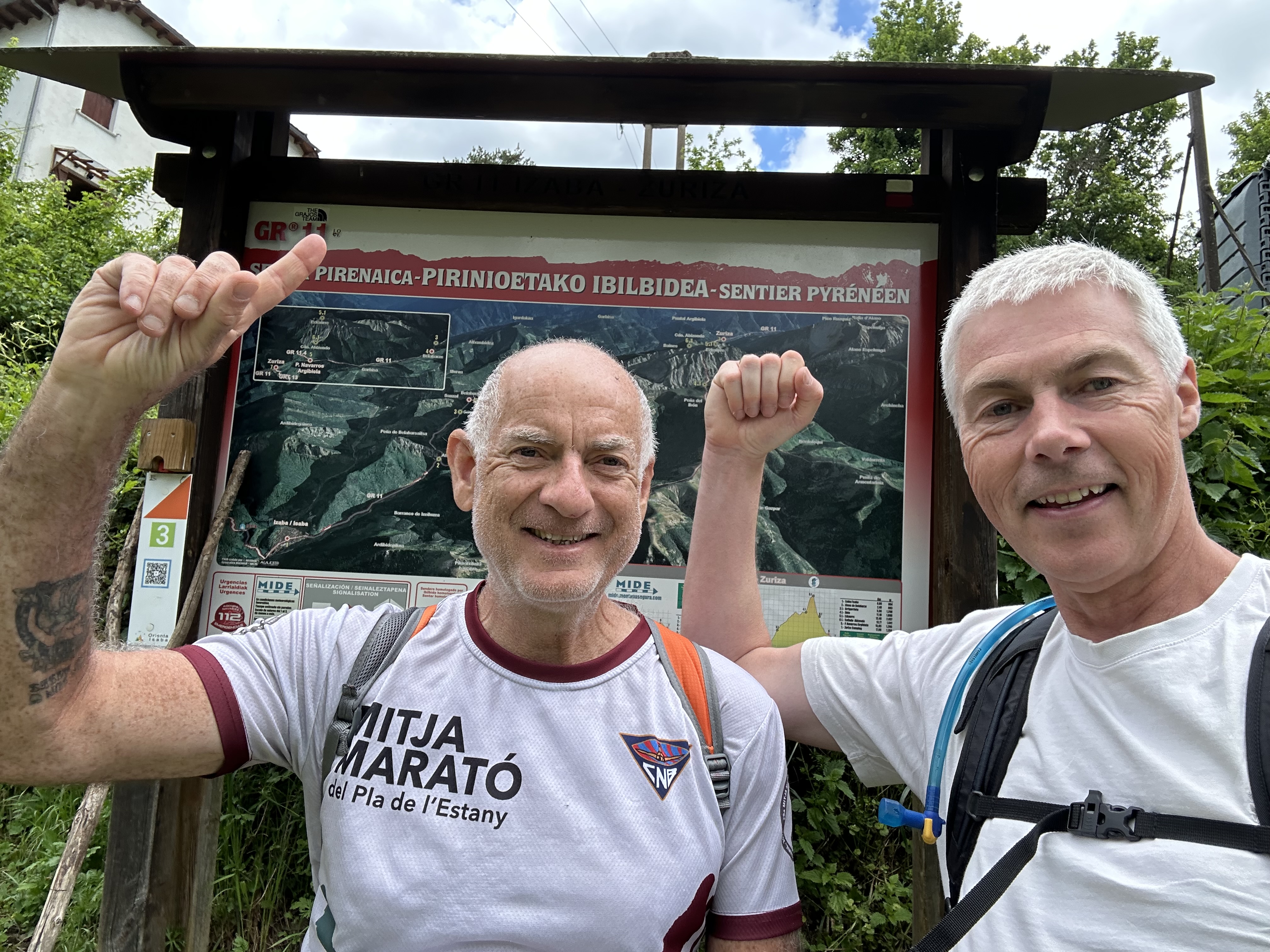 At this point, we turned back and headed off down the road once more, again having to take evasive action away from a bull smoking a cigarette and his hareem. Here’s one of Jason and I back at the same GR11 signpost we had started the days walk from – we even made it before the rain!