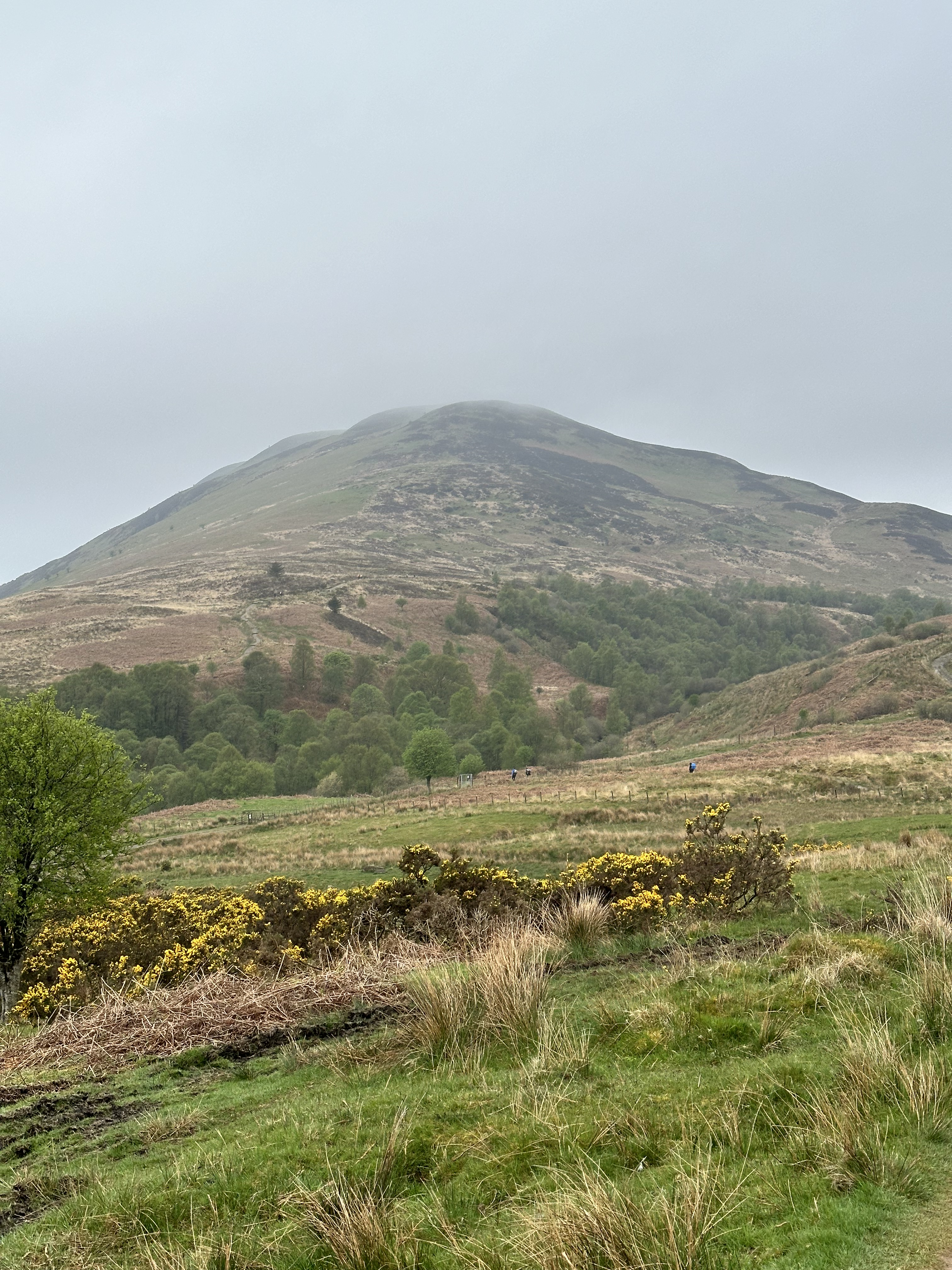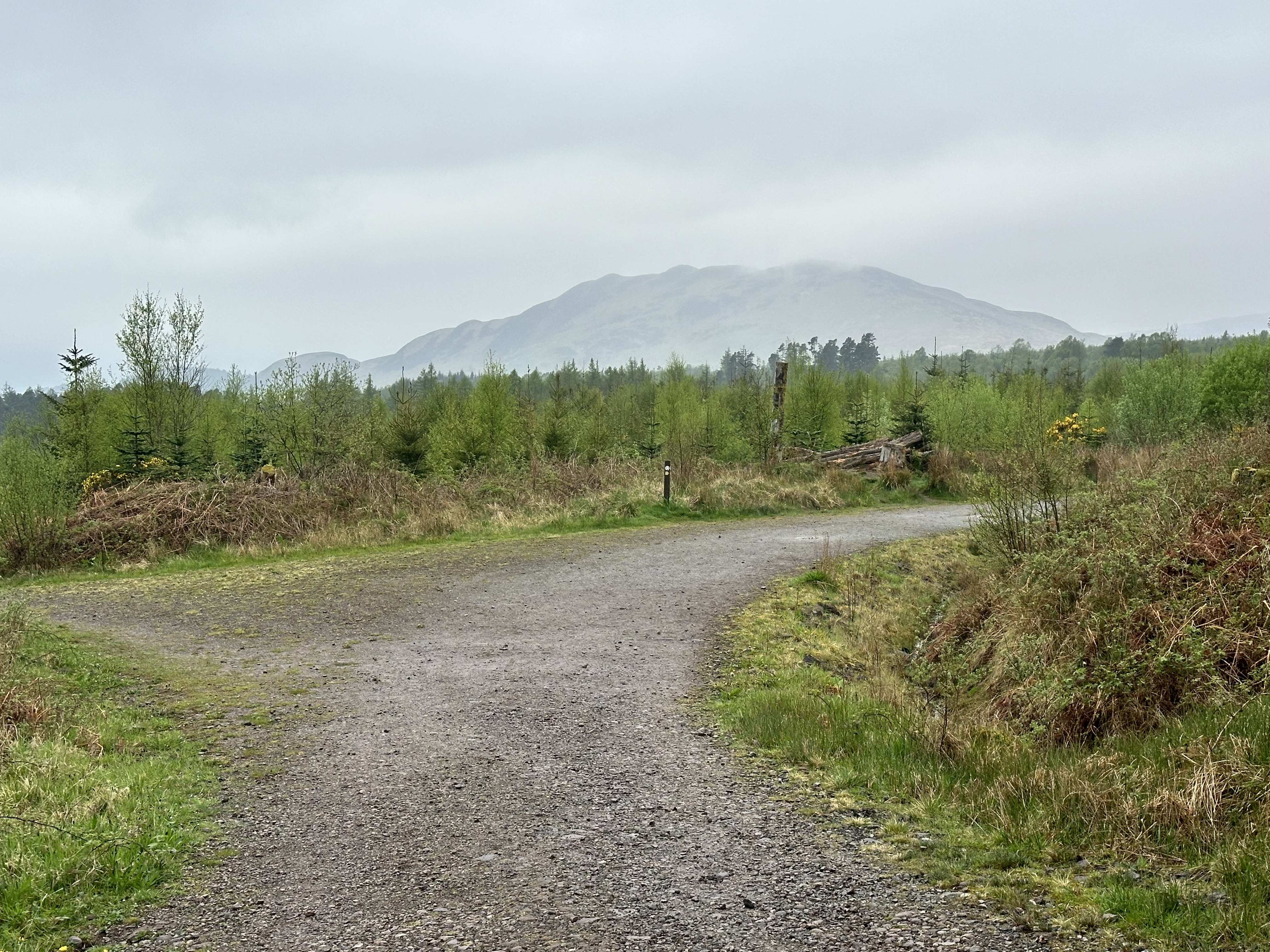Walking through Garadhban Forest the first views on Conic Hill loom into view. The top of Conic Hill is just visible as the cloud begins to lift.
