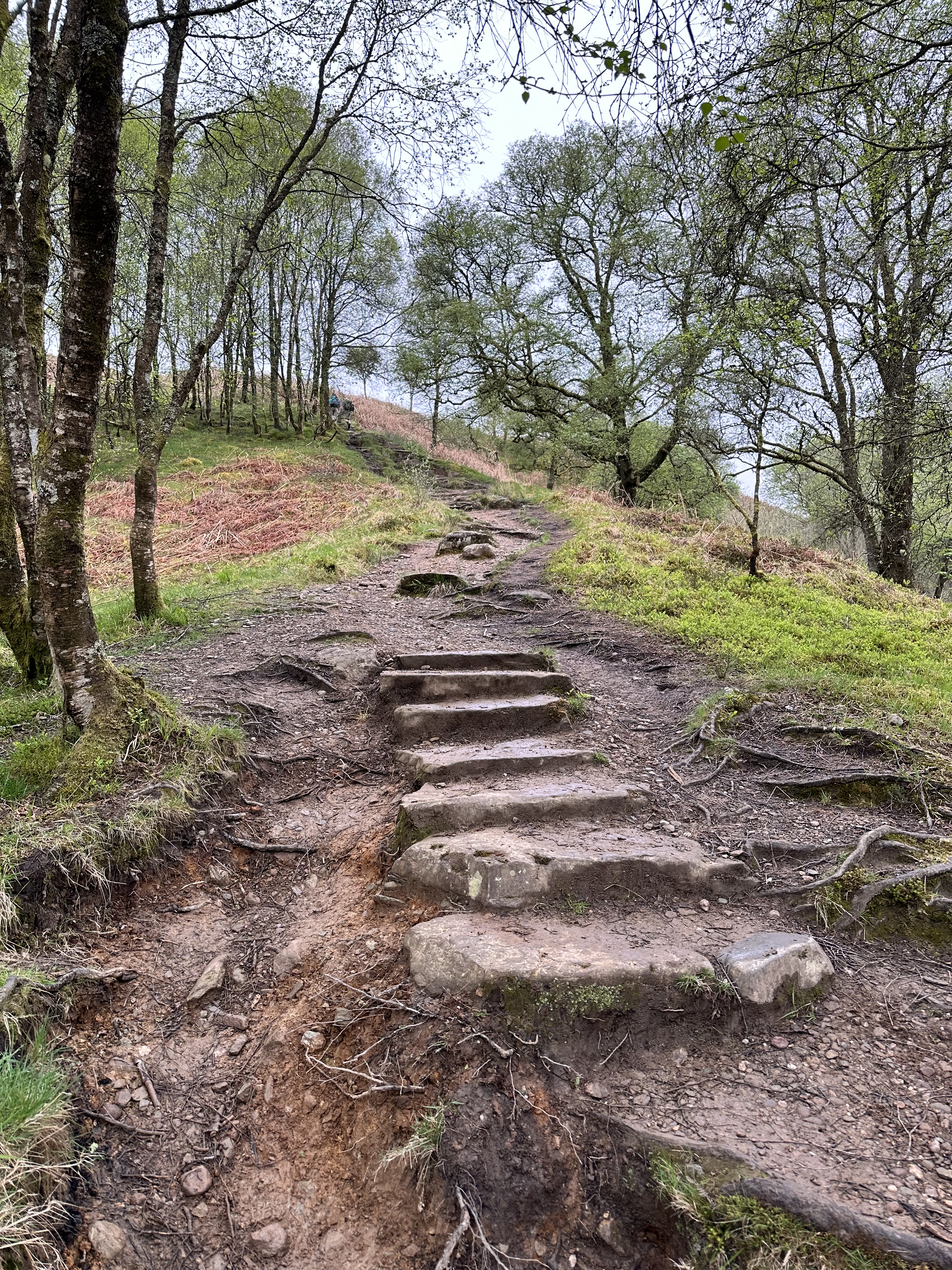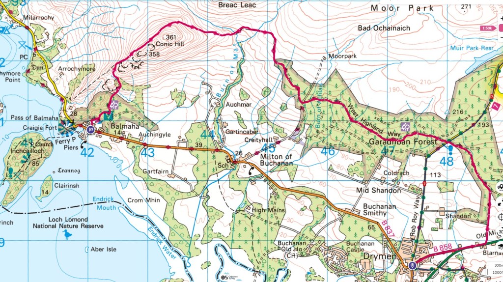 Day 2 meant a brief walk back to join the WHW as the path only skirts the edge of Drymen. It also meant an unplanned solo walk as the food poisoning from the prior night’s dinner had scuppered any thoughts Sam had of walking that day. Fortunately for her Balmaha, being the end of today’s walk, was only 4 miles away as the crow flies, so a quick jaunt on the local bus meant she was in Balmaha for some R&R in no time at all.