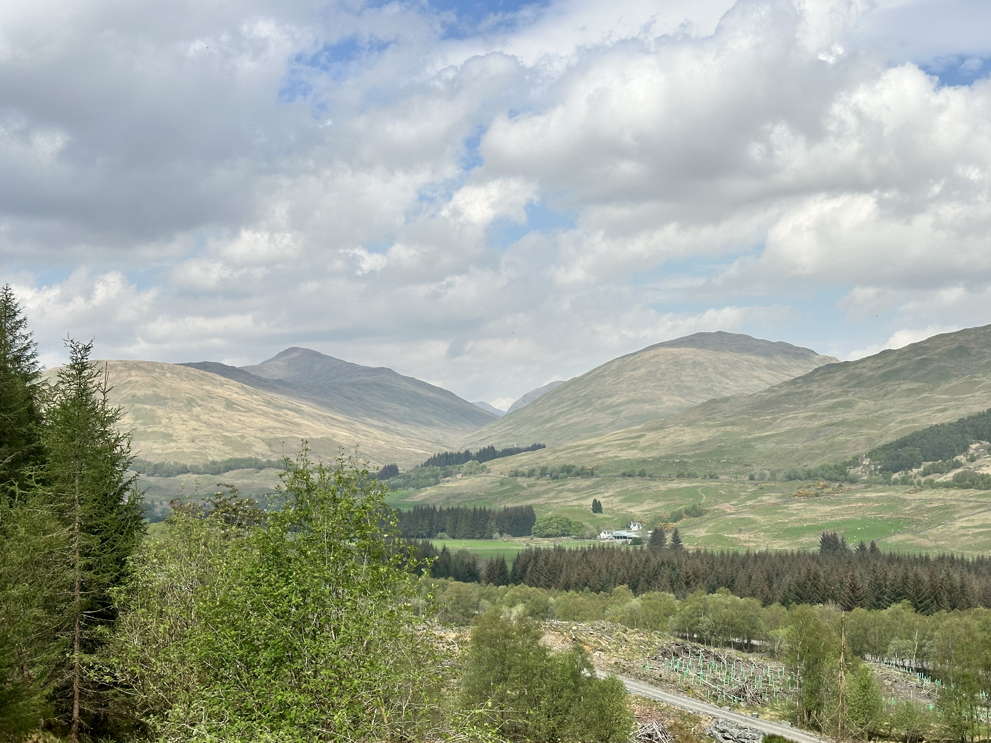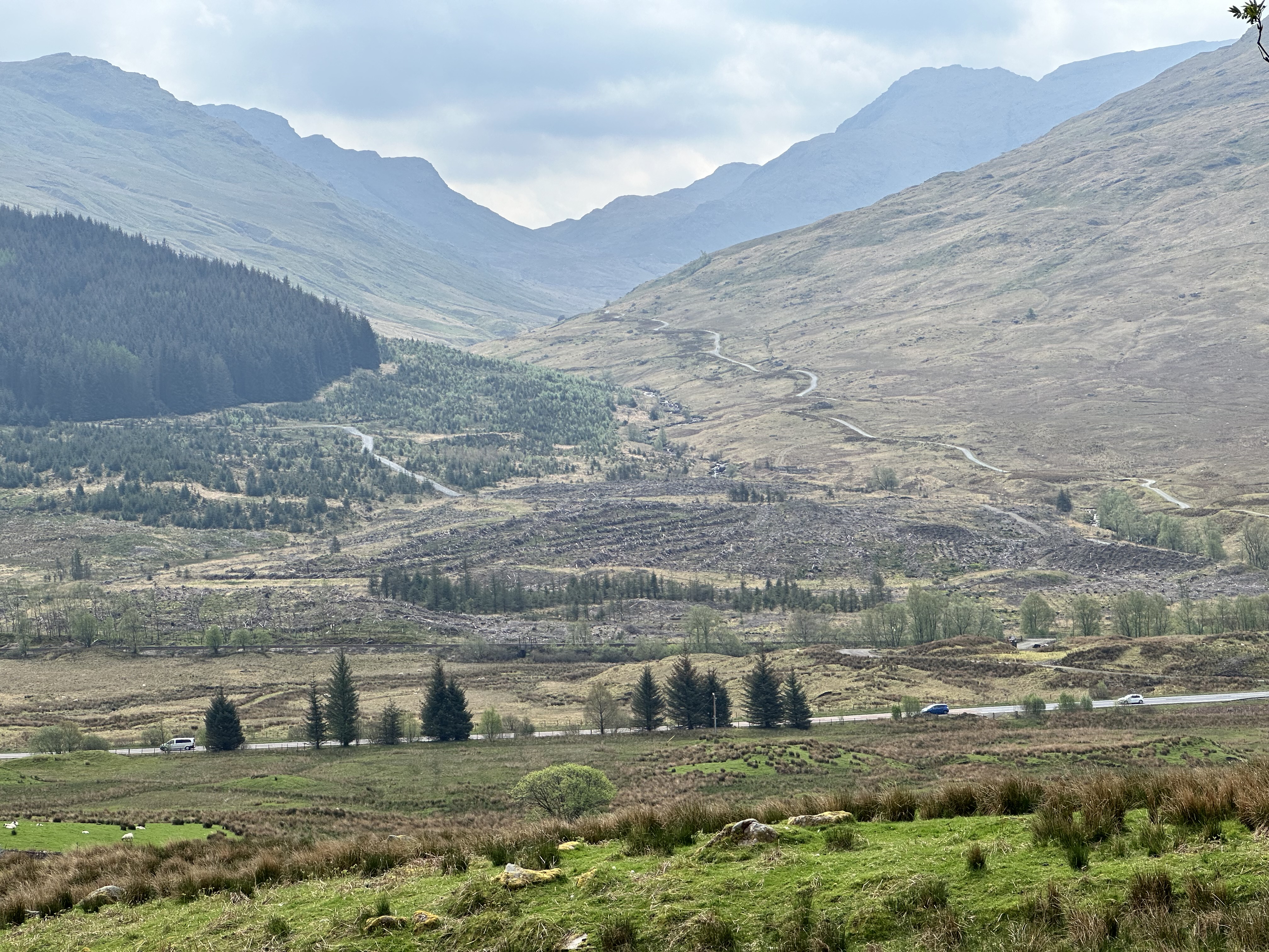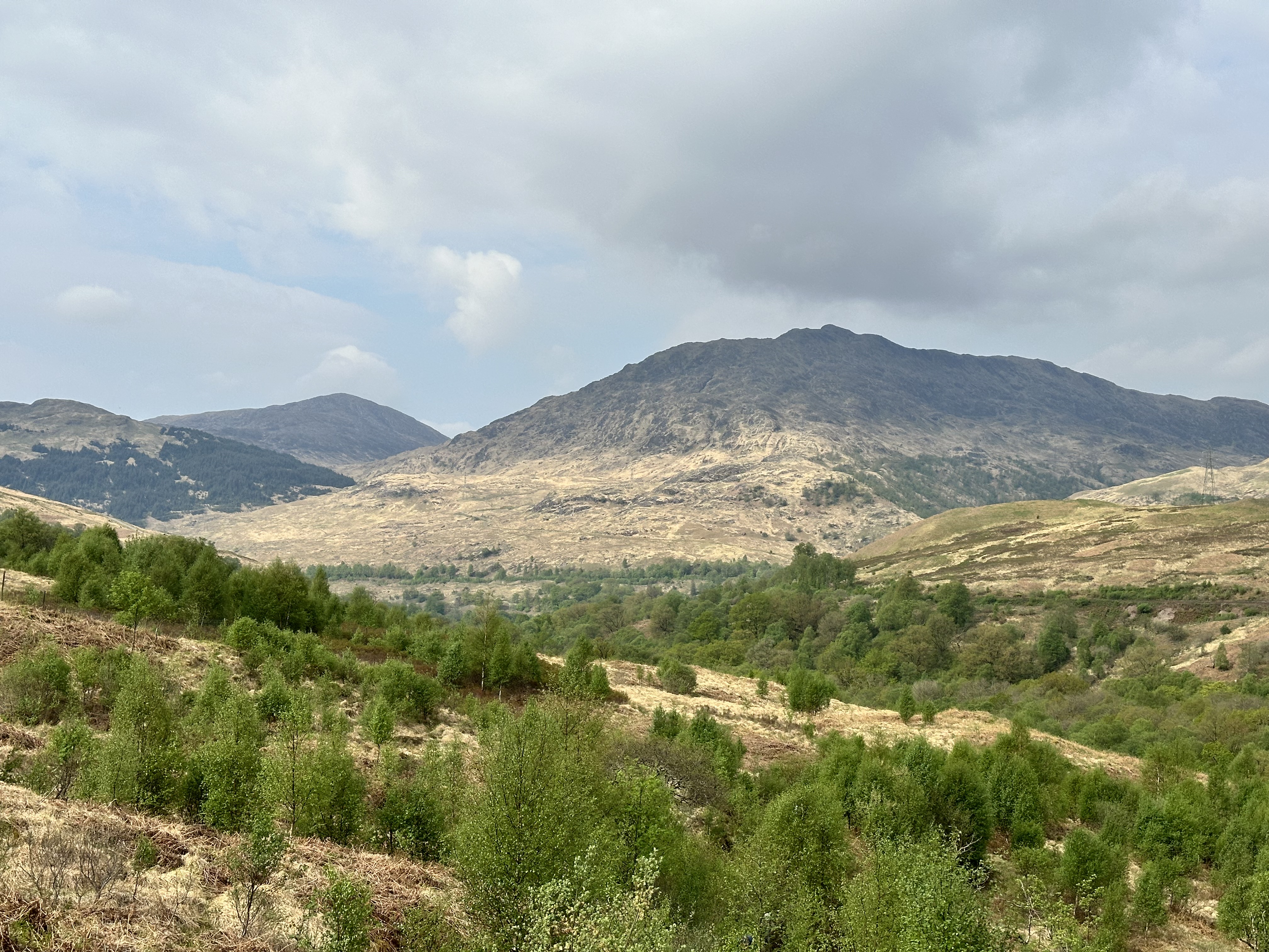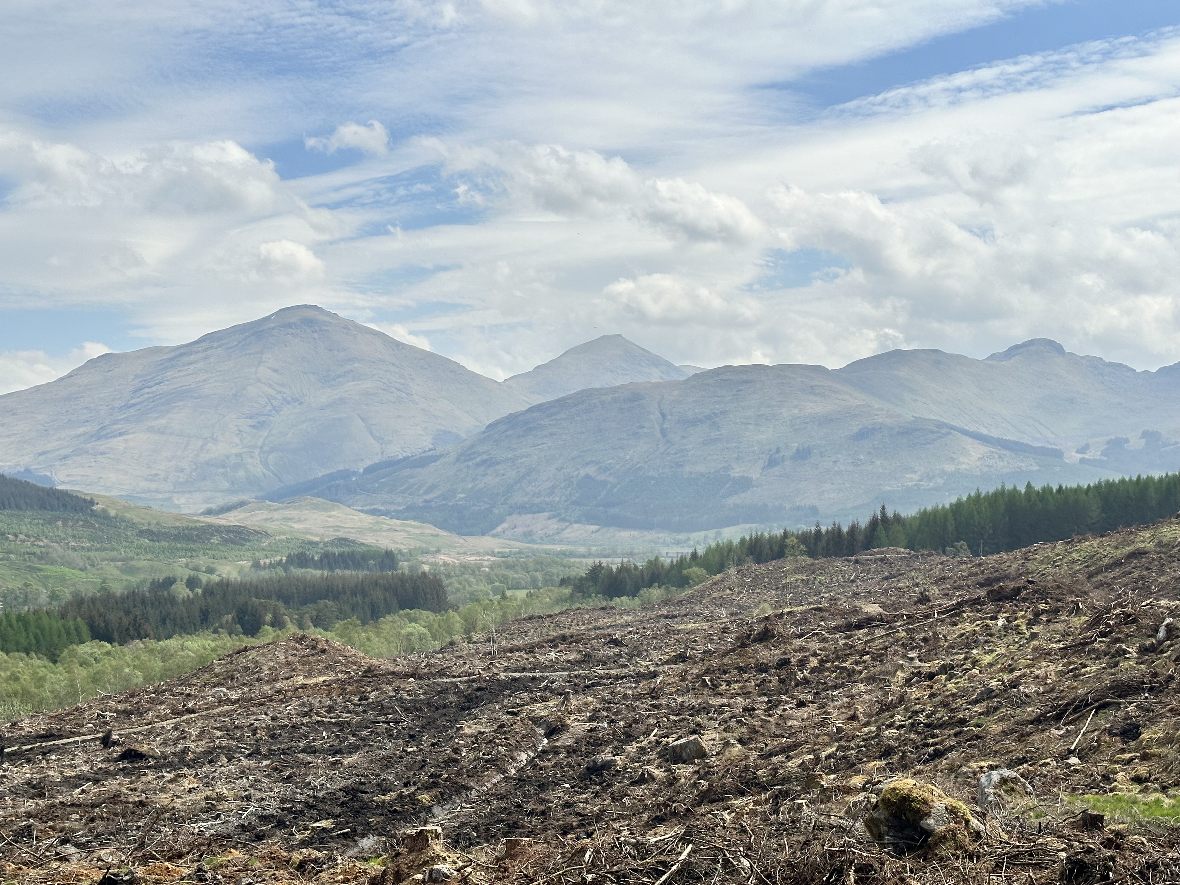 Having turned the corner, the forest had been cleared, which made for a fairly desolate view. It did provide another chance to see Ben More and Stob Binnein away towards the south east.