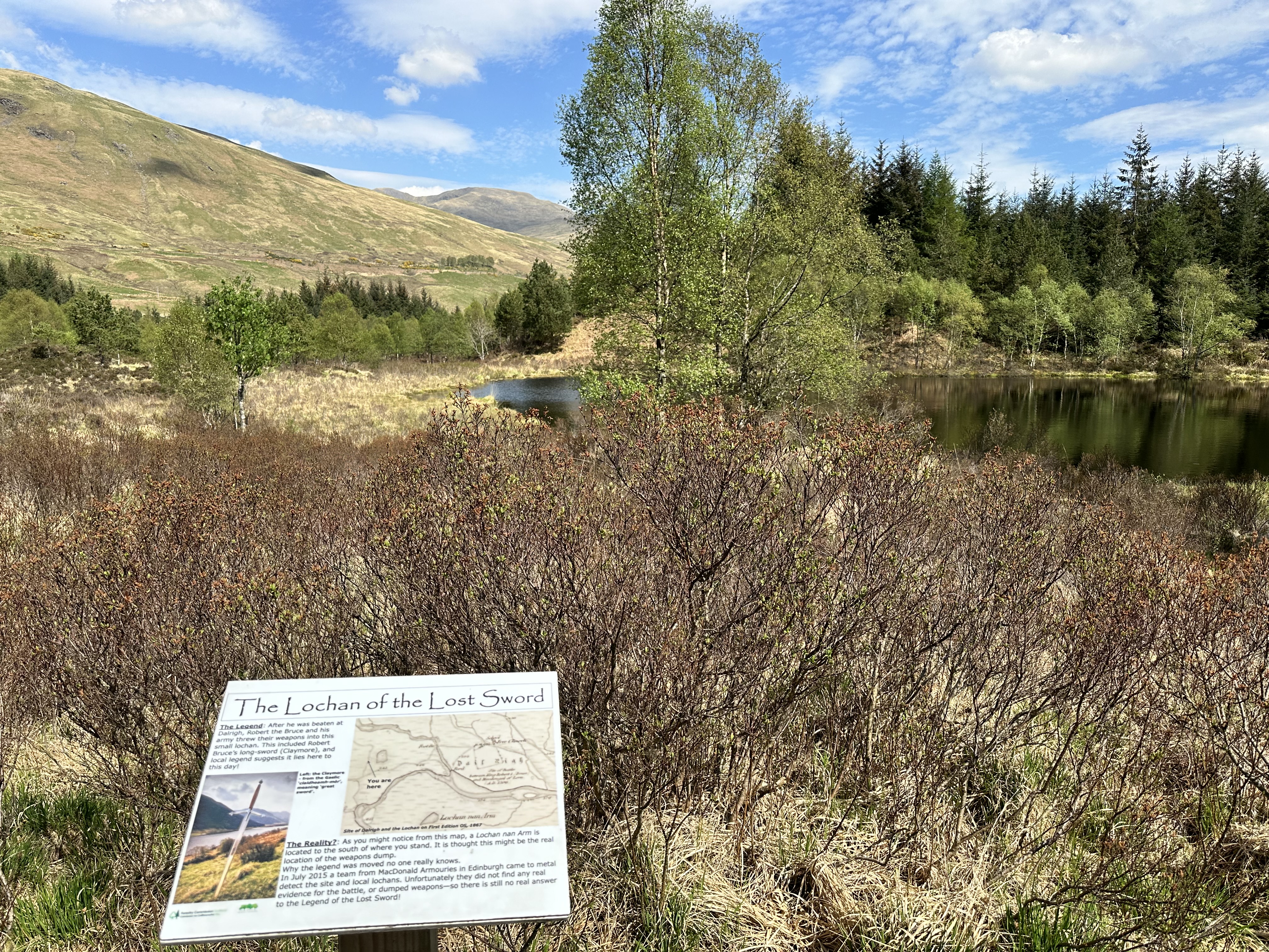 On the final approaches to Tyndrum, the path twisted along the river Crom Allt into some woodland, exposing a small lochan. As legend has it, this is the site of Robert the Bruce’s weapons after he threw them in to the lochan, including his long sword, after his army lost a battle here.