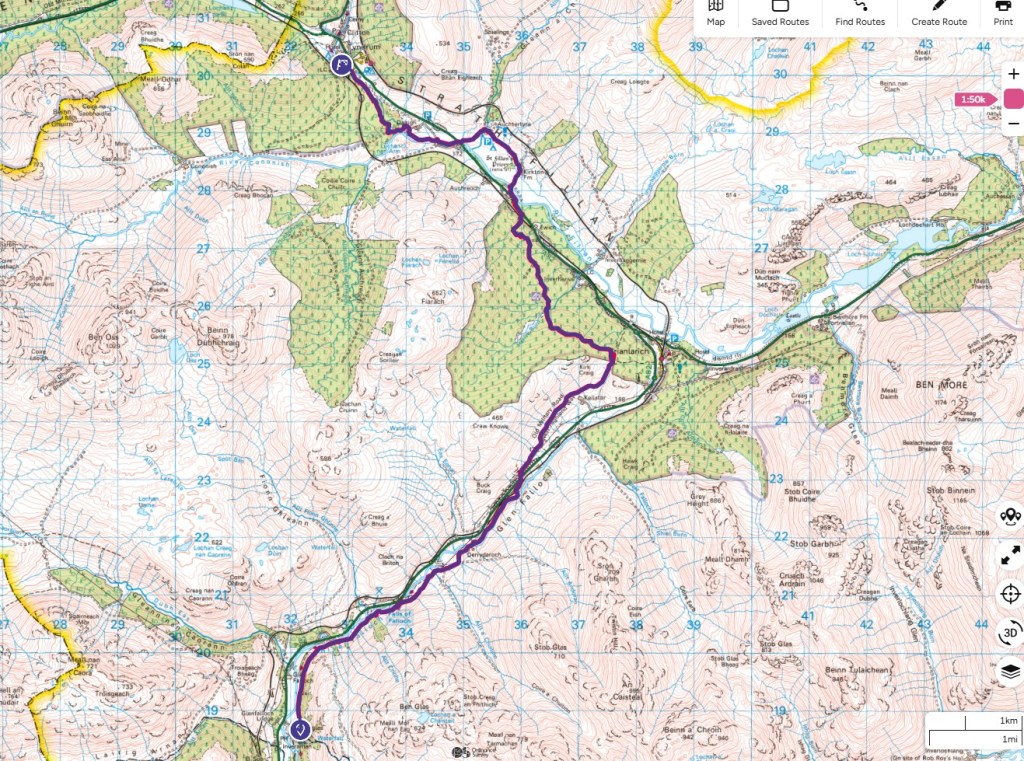 Today’s route followed the A82/A85 road and also the train line to Oban and Fort William. The train track split into 2 lines at the next town, Crianlarich about 6 miles away, with one branch going to Oban, the other to Fort William. Both lines go to Tyndrum, our next overnight stop. One stop, Upper Tyndrum, serviced the stations to Fort William, whilst Lower Tyndrum serviced stations to Oban. For such a small place it seems odd to have 2 stations (but given the terrain, entirely understandable).