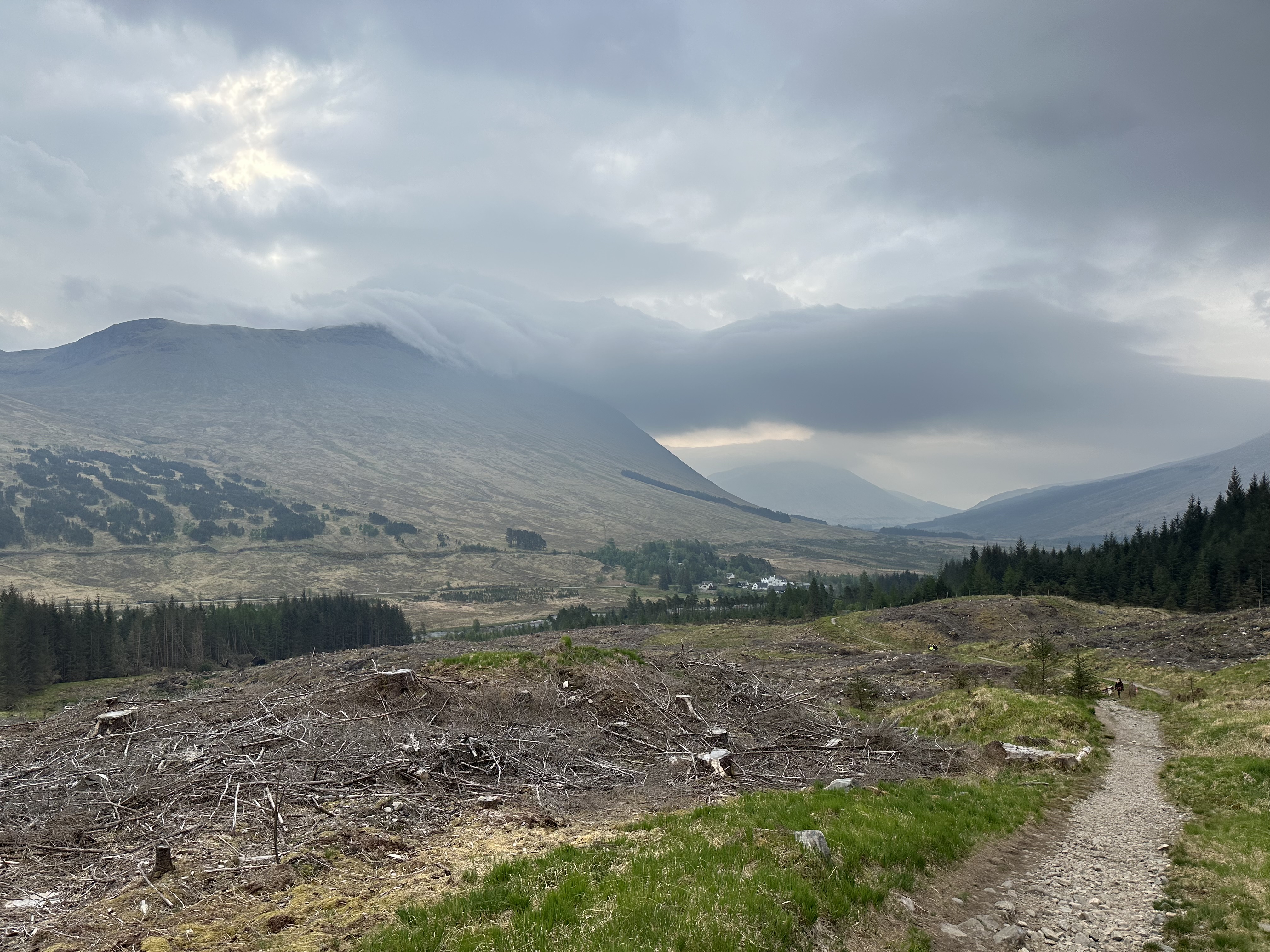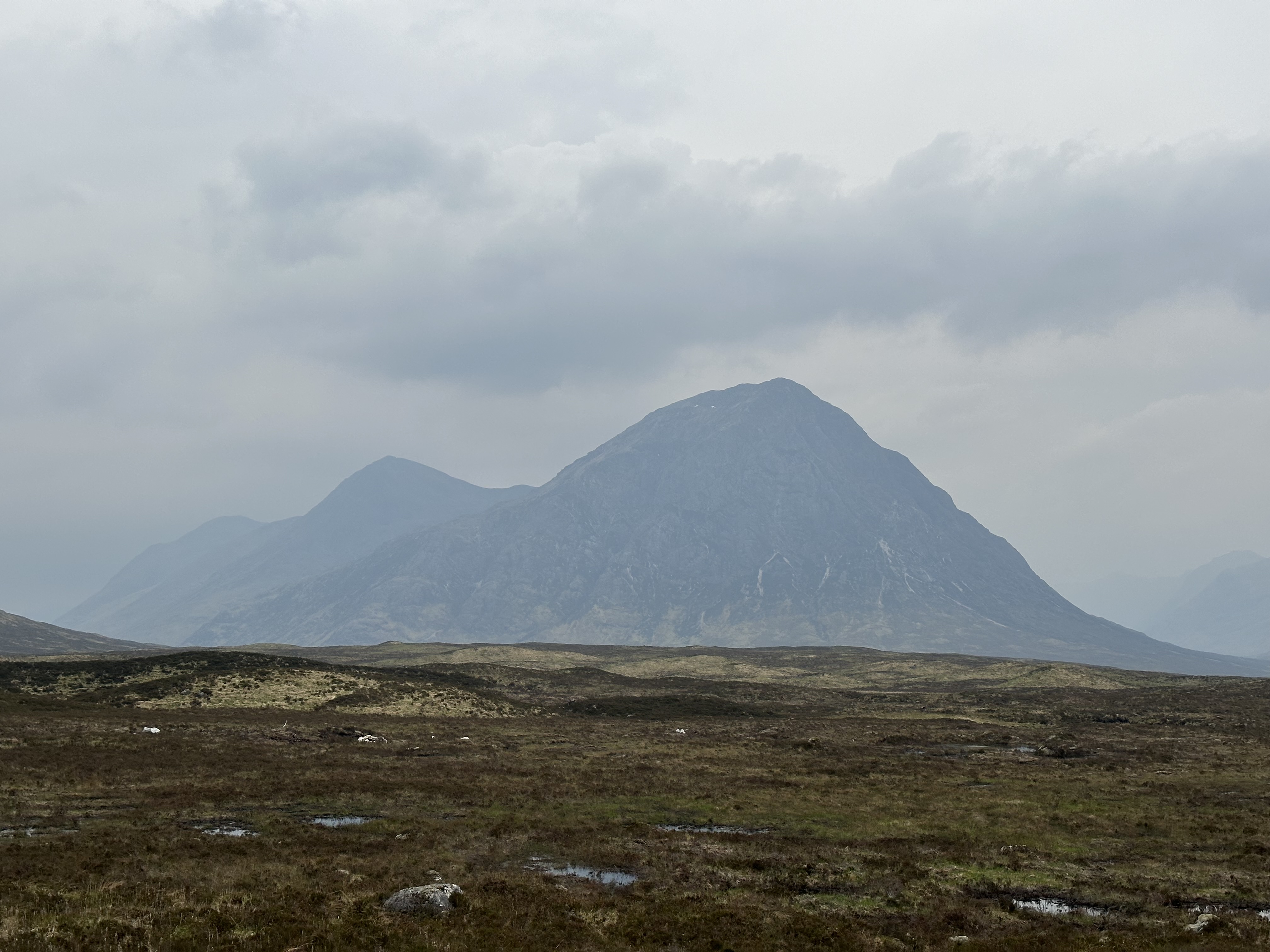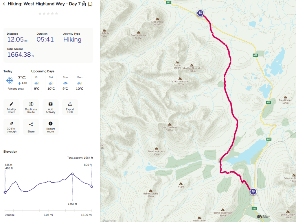 A return to overcast and cloudy conditions but mercifully no rain. The rain started 5 minutes after hitting the end of our walk in Kingshouse so the gods seem to be smiling on us.