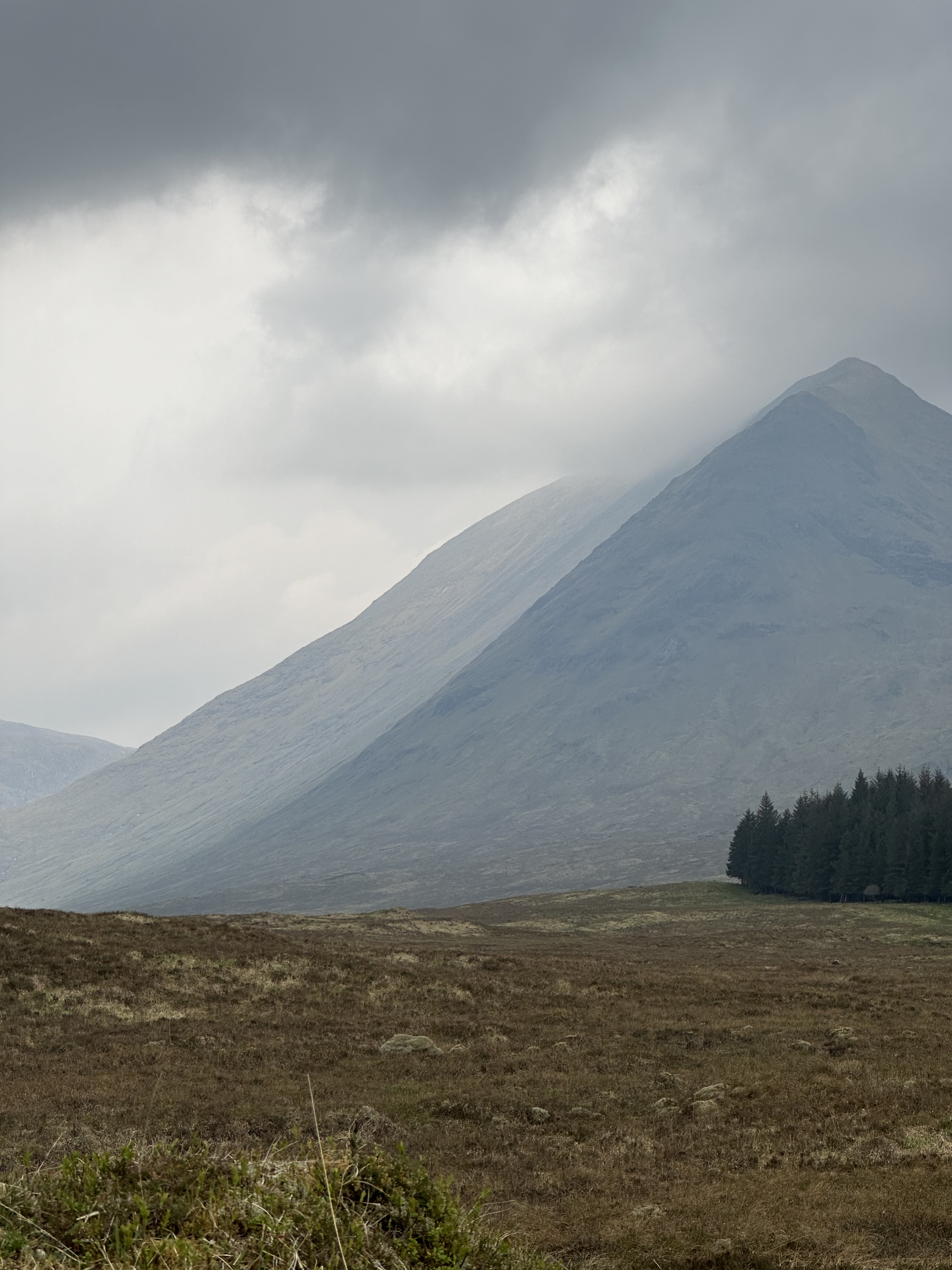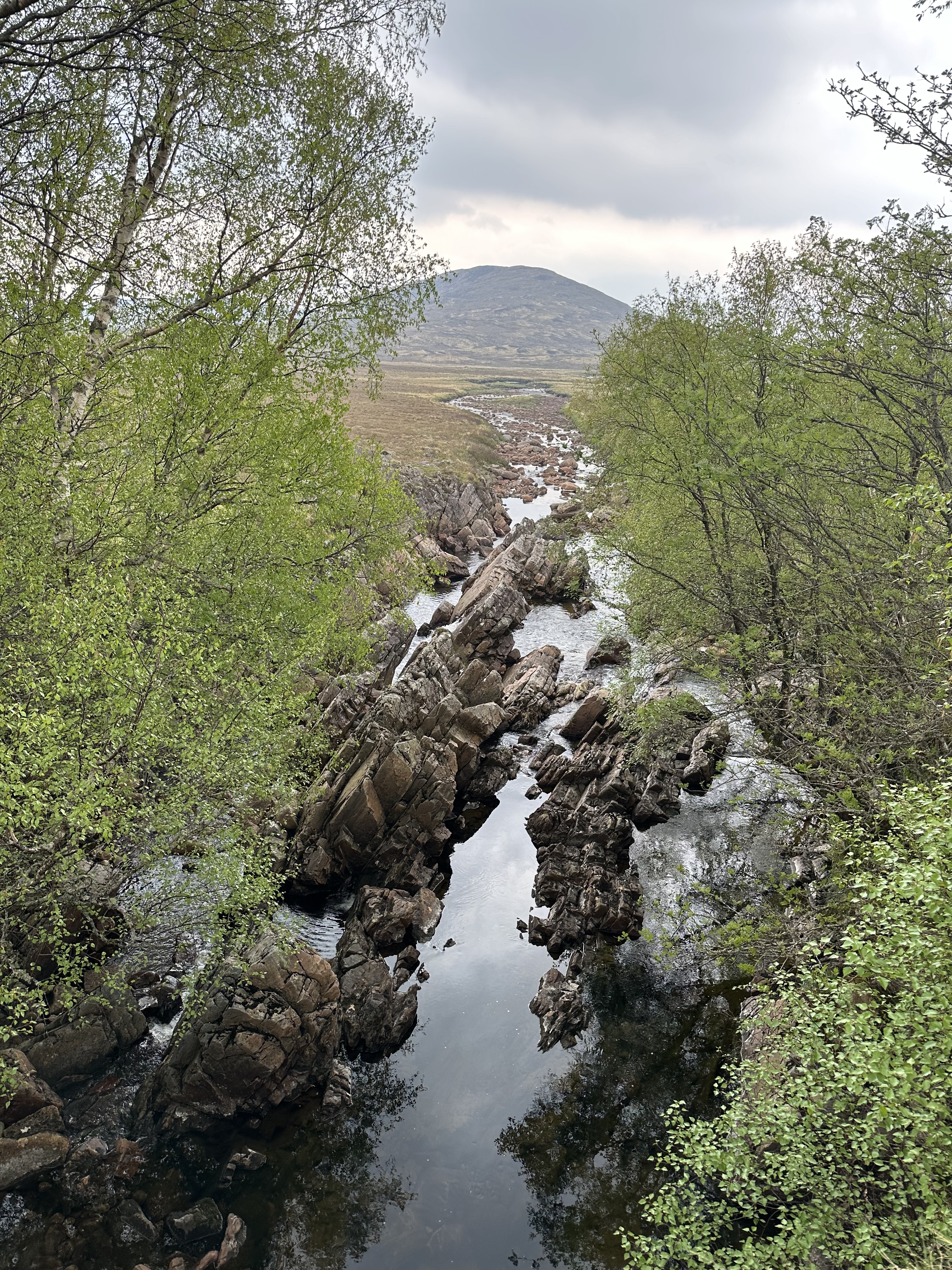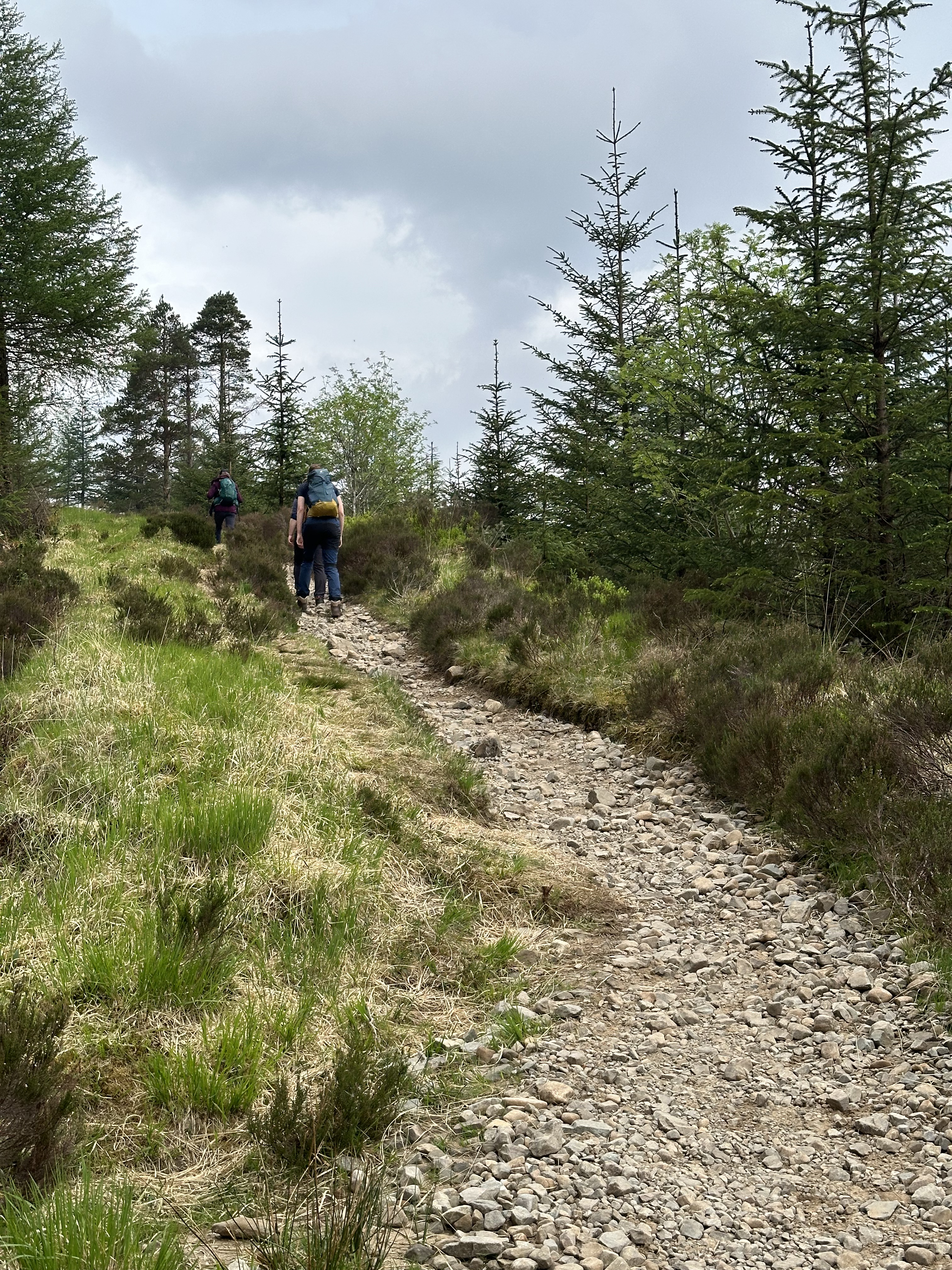 A return to overcast and cloudy conditions but mercifully no rain. The rain started 5 minutes after hitting the end of our walk in Kingshouse so the gods seem to be smiling on us.